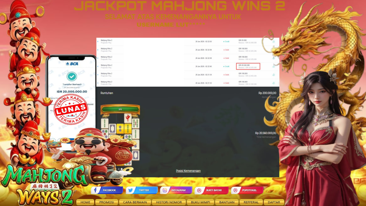 Selamat kepada USER ID :LUT***** Telah berhasil mendapatkan kemenangan besar pada JACKPOT MAHJONG WAYS 2 RP 20.000.000,- LUNAS Setelah mengisi formulir withdraw dengan kurung waktu hanya 5 – 10 menit pihak popotogel sudah melakukan transfer kepada pemilik USER ID dan dana sudah dapat dicairkan oleh pemenang. Bukti pembayaran yang kami berikan merupakan bukti pembayaran yang SAH / VALID yang langung di dapatkan melaui tanda transfer transaksi dari Bank yang dituju.